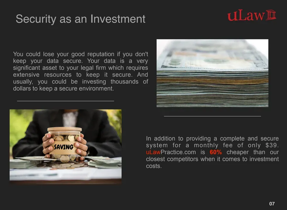 As seen in the slide above, uLawPractice takes this commitment to security to heart. But we also don't want to be over-charging for our services. That's why uLaw charges clients in actual Canadian dollars, at a greatly reduced cost compared to other software on the market today.