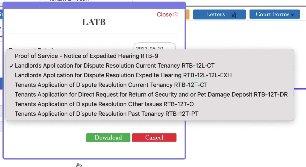 Note: there are many separate forms that can be generated based on who your client is. You will be able to select the relevant court form from the dropdown menu. In the event you are representing a tenant, you will see forms for tenants, and the same goes for landlords as well. uLawPractice also handles court forms for other areas of practice, we're just using landlord & tenant as an example.