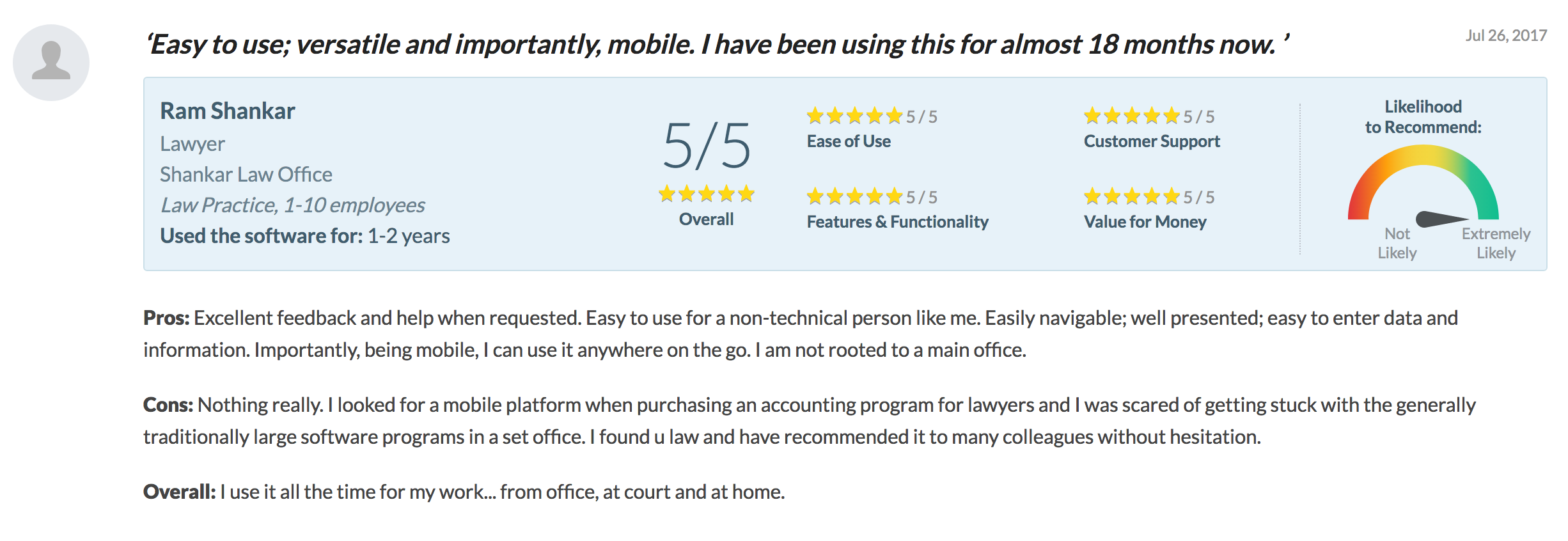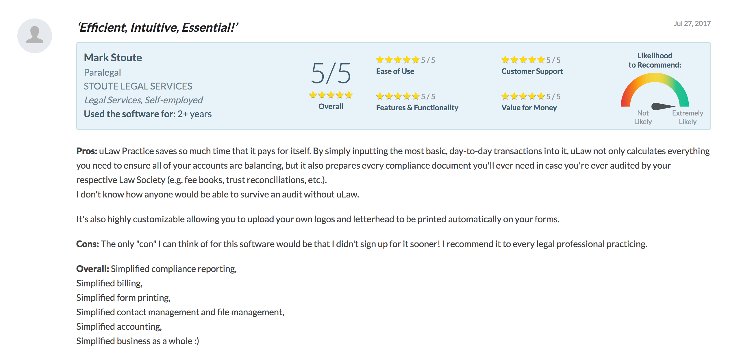 In a testimonial titled "Efficient, Intuitive, Essential!" penned by Paralegal Mark Stoute, uLaw Practice scored 5/5 for its ability to save time so other tasks can be performed during a regular work week.