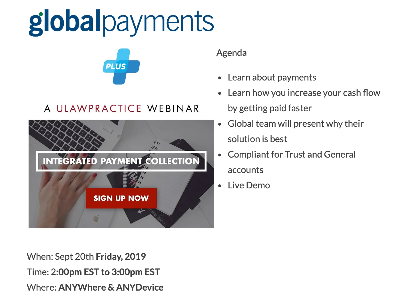 Join the uLaw team on Friday Sept. 20, 2019 from 2-3 p.m. to learn more about how integrated payments can improve your legal business.