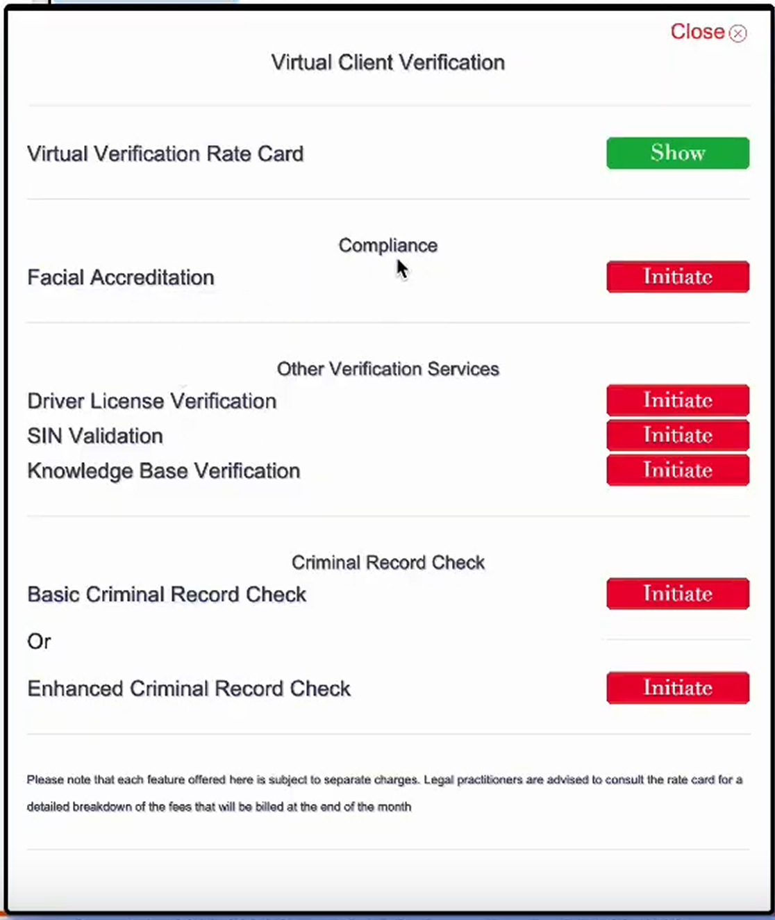 For demonstration purposes, let's stick with facial accreditation. Select that button. Here you'll be prompted to accept that you understand you're paying the rate for the Virtual search. Be sure to review the rate card, which can be viewed by clicking the green button. (see image)