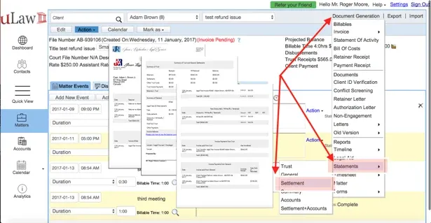 Instead of juggling more than a dozen documents all at once just for a single client, a practitioner can navigate to “Document Generation” and produce a settlement statement and let software do all the heavy lifting associated with producing advanced analysis of a firm’s handling of disbursements, fees, etc with ongoing legal matters.