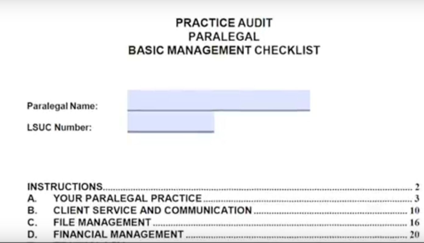 This means that every four years a paralegal in Ontario can be expected to produce a myriad of documentation indicating evidence of sound practice management. During this procedure an auditor will provide a copy of Ontario’s “Basic Management Checklist” for a practitioner to review, often with the assistance of a legal accountant or assistant who can help obtain the data necessary to satisfy the requirements.