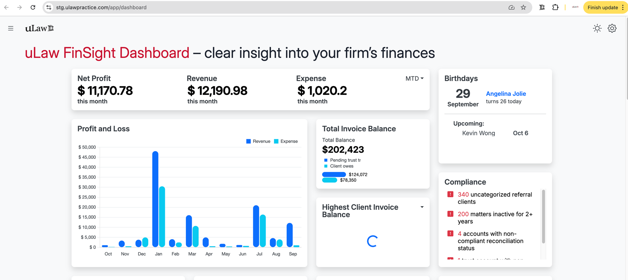 That’s why the uLaw FinSight Dashboard includes Profitability at a Glance: a clear, instant breakdown of your revenue and expenses, displayed as profit and loss figures across monthly, quarterly, and yearly views.