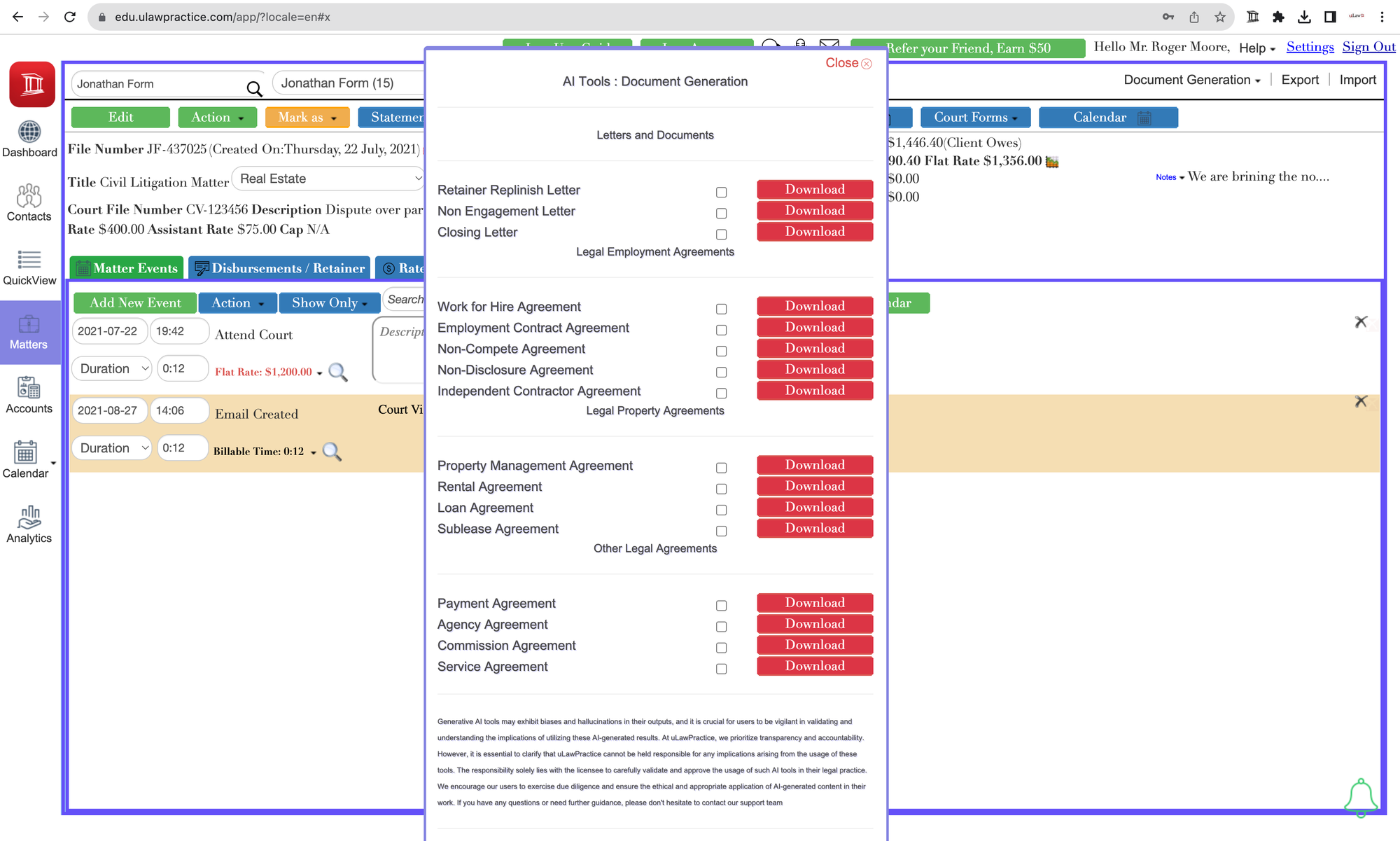 Document generation in legal practice has long been a laborious and time-consuming process. Lawyers, especially solo practitioners, often find themselves grappling with drafting various legal agreements, letters, and forms. Here is where uLaw's AI and ML capabilities step in to revolutionize the entire paradigm.