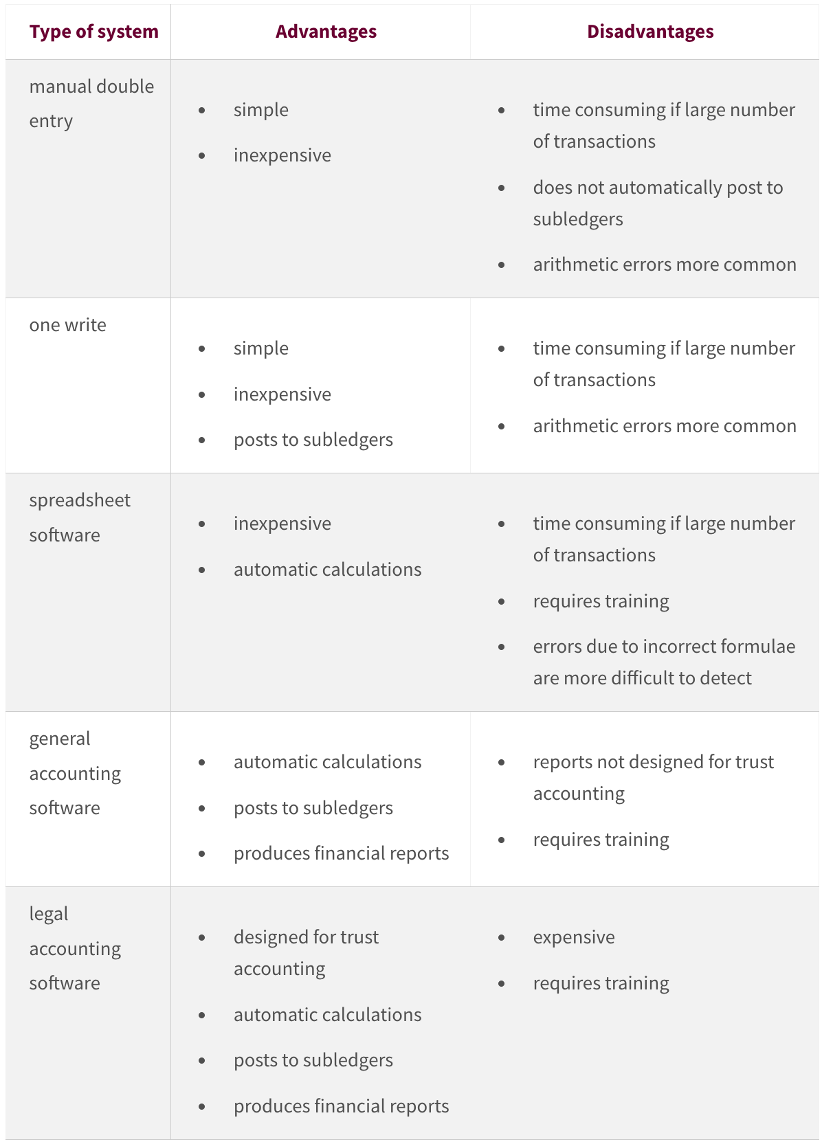 The LSO highlights several accounting systems, from manual double entry to spreadsheet software and general accounting programs. Each system caters to different needs but often requires a substantial understanding of accounting principles. The LSO publication can be read by clicking here