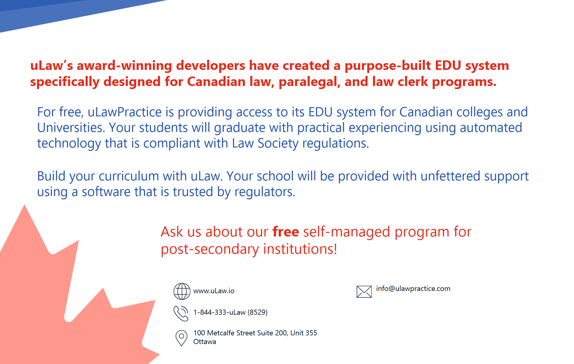By incorporating uLawPractice EDU into their curriculum, Canadian law schools and paralegal schools can help their students become more attractive candidates for employment. Employers value candidates who possess a diverse set of skills, including accounting and practice management, and the incorporation of uLawPractice EDU can help students stand out from their peers. - Cost-effective