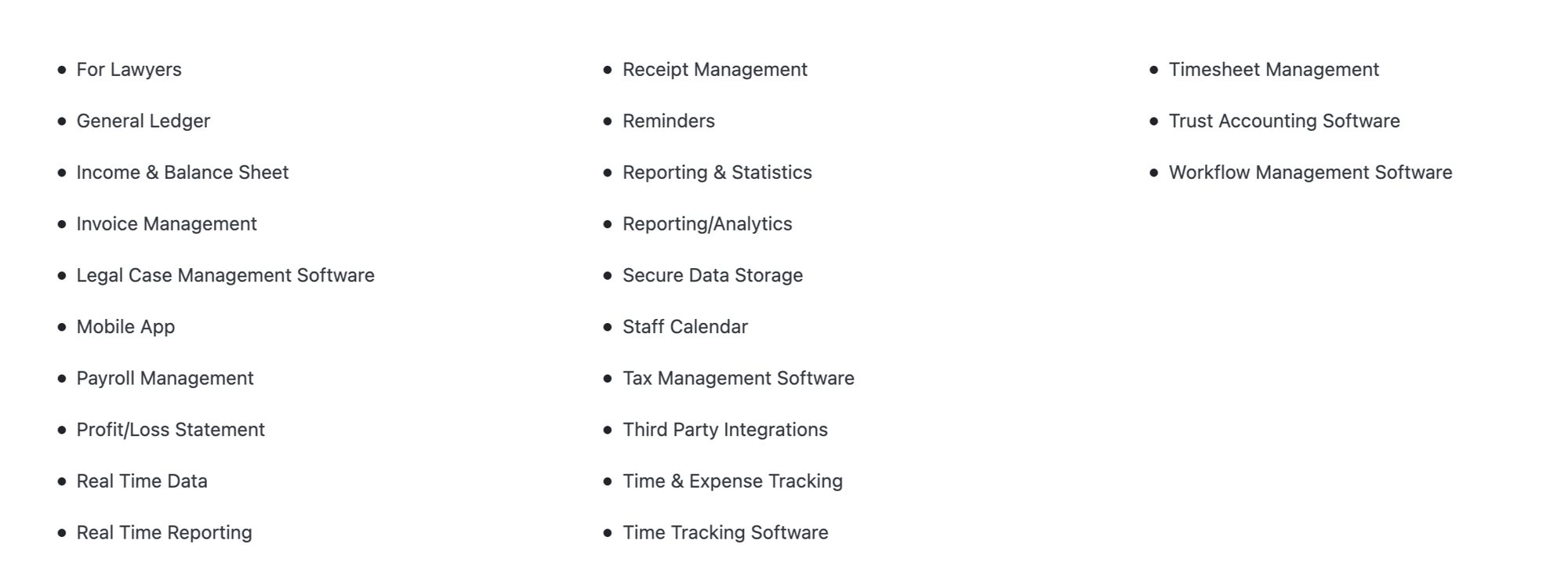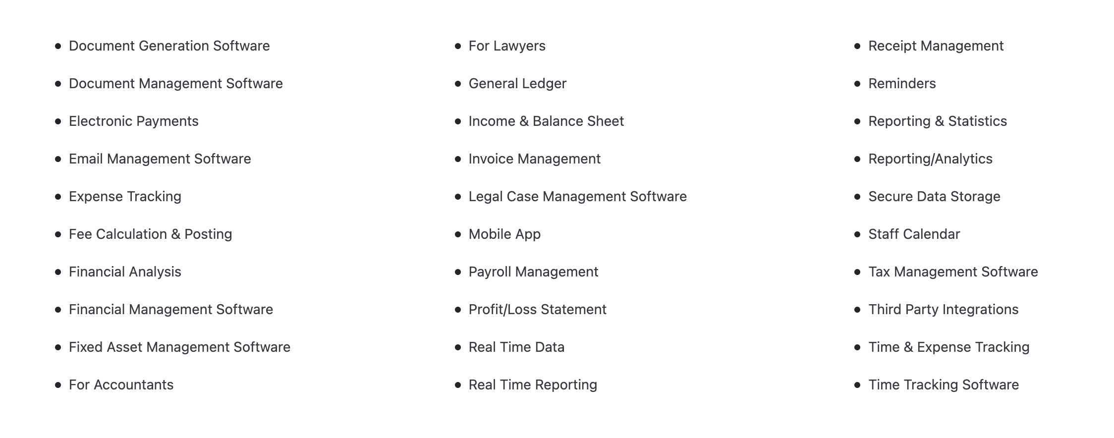 uLaw does all this at a single price of $49 CAD when paid annually refer here for more detail https://www.capterra.ca/software/150100/ulaw-practice