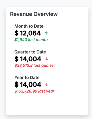 The left-side Revenue Overview panel shows three familiar accounting lenses: Month to Date, Quarter to Date, and Year to Date. These are not cosmetic labels! They are time-bounded analytical windows, and each tells a different story.