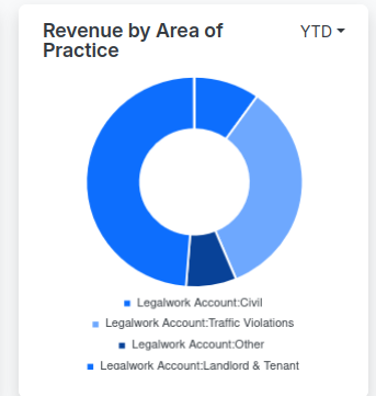 The donut chart in the center, labeled Revenue by Area of Practice, is one of the most useful parts of the visuals found in the dashboard. With respect to revenue, it is segmenting total revenue by its category; which in the screenshot includes Civil, Traffic Violations, Other, and Landlord & Tenant.