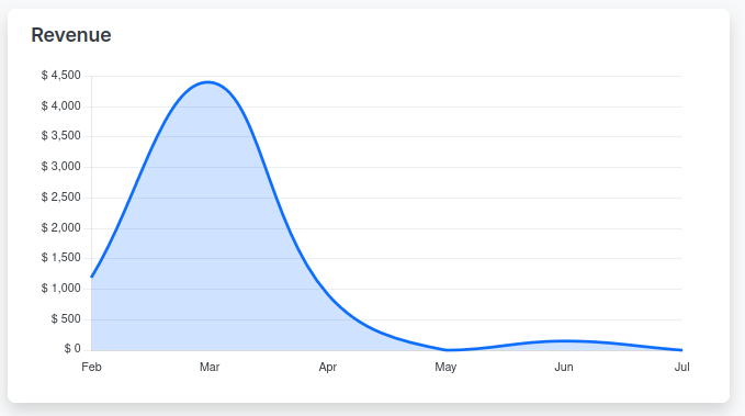 The right-side chart plots revenue over time, by month. In the image, the curve rises sharply into March, falls through April and May, and then shows only a modest bump in June before tapering off. Even without advanced statistics, this is useful trend analysis.