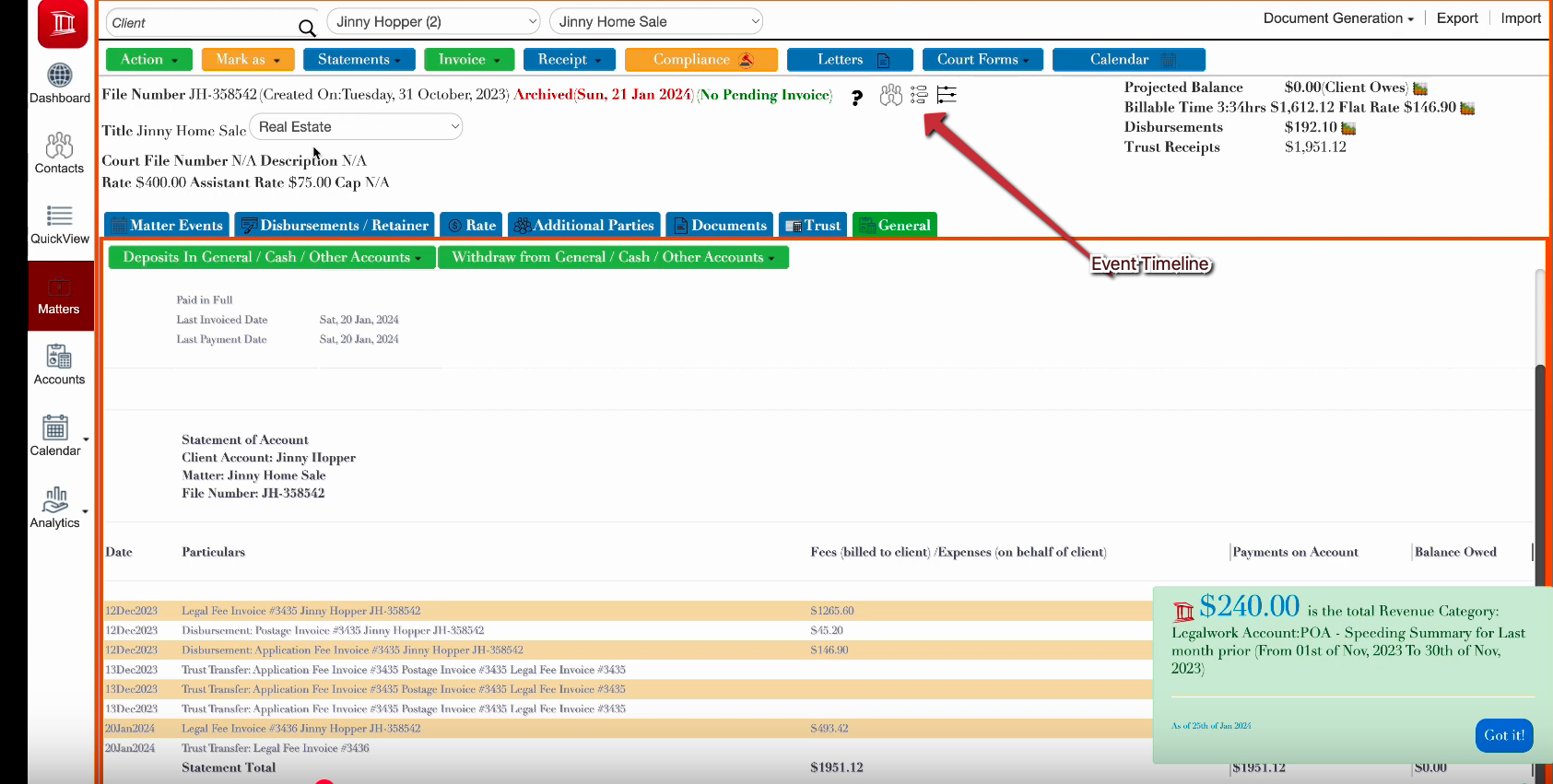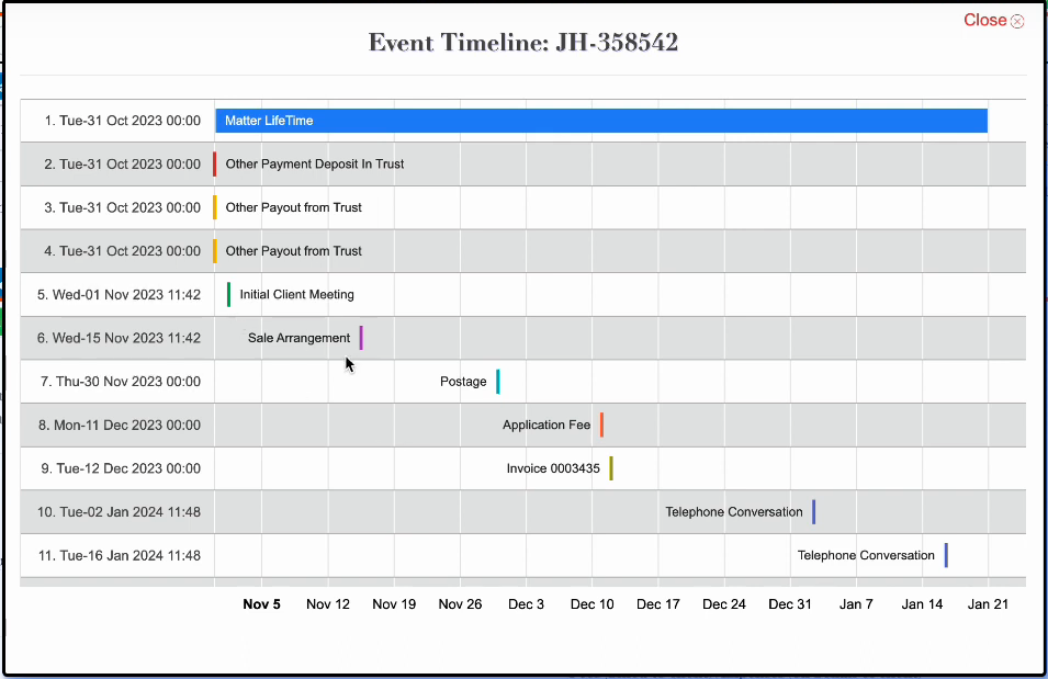Despite having a "Matters" interface, which shows all the events, trust transfers, disbursements, invoices, fees, applications and so on, there is a way to visually graph how these events took place through time.