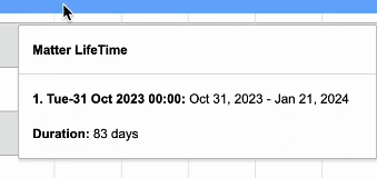 Now, when you navigate over certain components of the event timeline, it will display even more information. As in the example above, we can see that there is a running calculation of the lifetime of the legal matter.
