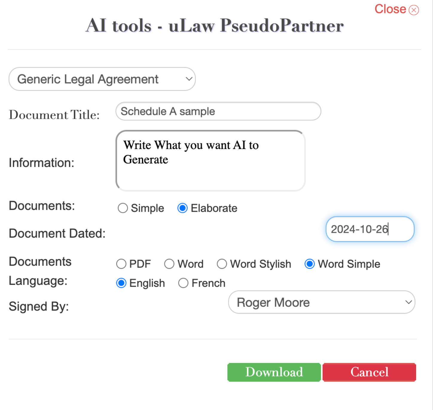 Example screenshot of uLaw PseudoPartner with generic legal agreements: