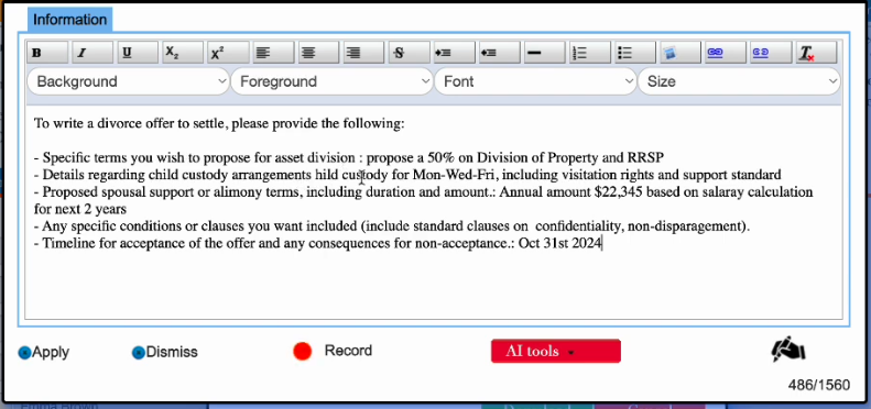 When used, uLaw PseudoPartner will ask the user to provide certain criteria pertaining to the matter at hand. Whether its a specific type of letter or other document, the AI-model has been trained to understand what criteria needs collecting before it can begin drafting the document based on the type of legal matter being handled by your firm.