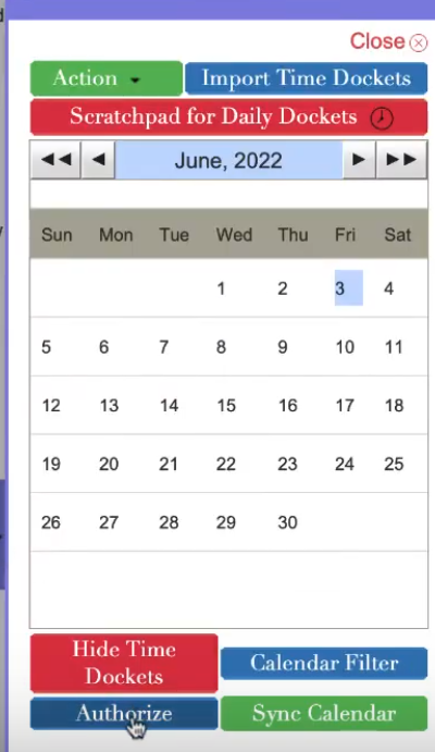 When in the uLaw interface, under Calendar (left-hand column), you will see a small black arrrow, like in the image below. (You can also provide authorization from the Matter window as well, up to you)