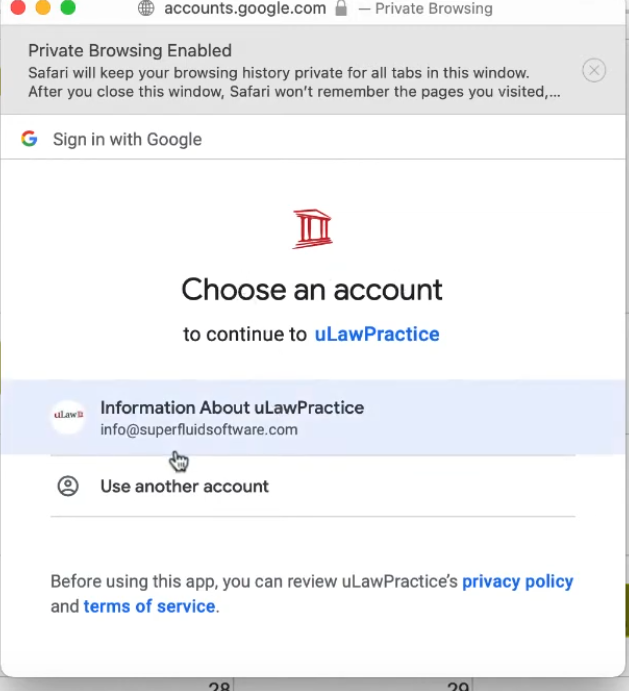 Eventually if you navigate through this google integration window you'll be asked to provide permission to uLaw so we can integrate with your Calendar and Google Drive. These integration permissions are important since they're required for uLaw to send data to your drive and calendar on your behalf.