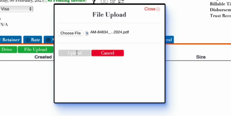 In the example, we navigate to "Matters" and download a settlement statement for a particular client. Then, we click "upload" and select the file and upload it.