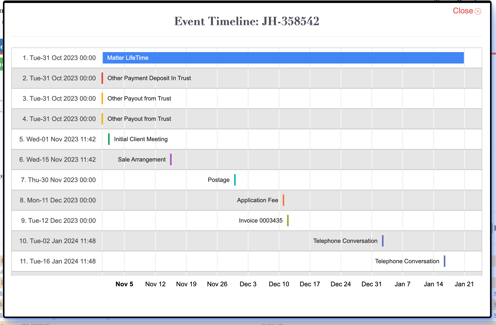 Recently, a lawyer contacted our support team with a specific query: he needed to understand the sequence and timing of his fee payments for a case. The Timeline screen addressed his query in seconds, showcasing the practical utility of this feature. This scenario exemplifies how the Timeline can serve as a quick, efficient solution to complex queries that would otherwise require tedious manual data sifting.